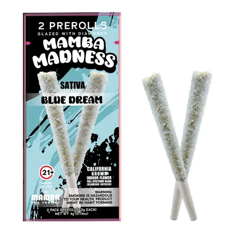 Blue Dream Mamba Madness Diamond Infused Pre-Rolls 2ct 4G are a classic choice, offering smooth, berry-like flavor with energizing effects. Each pack comes with two 2g prerolls glazed with diamonds for extra potency. Using California-grown indoor flower, these diamond-infused prerolls deliver a full spectrum blend that enhances focus and mood. Perfect for daytime use, Blue Dream provides clarity and energy while keeping a smooth finish. Convenient, premium, and powerful, this Sativa is crafted for smokers who want both taste and performance.