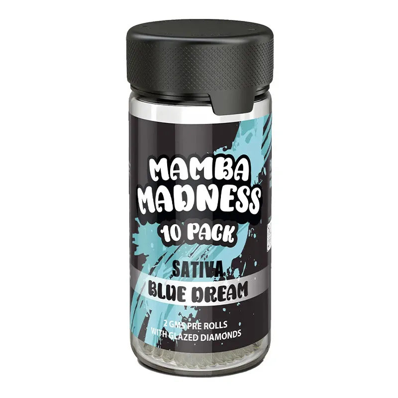 Blue Dream Mamba Madness Glazed Diamond Pre Rolls pair classic berry sweetness with glazed diamond potency. Each pre-roll includes 2 grams of premium sativa flower infused with THCA diamonds, offering smooth hits and uplifting energy. Perfect for daytime creativity and focus, Blue Dream delivers a strong yet balanced high. The reusable jar holds 10 pre-rolls, making it convenient and share-ready. Every puff brings bold flavor, reliable strength, and a luxurious finish designed for quality smokers.