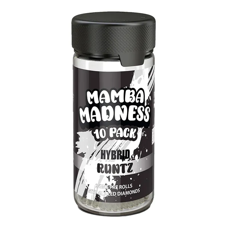 Runtz Mamba Madness Glazed Diamond Pre Rolls combine candy-like flavor with balanced hybrid effects. Each pre-roll is loaded with 2 grams of fire flower and glazed with THCA diamonds for a next-level smoke. Perfectly packed and smooth-burning, these pre-rolls deliver bold effects and a luxe finish in every hit. Conveniently stored in a reusable jar with 10 premium pre-rolls, Runtz offers a tasty, potent, and share-ready experience made for those who appreciate true quality.